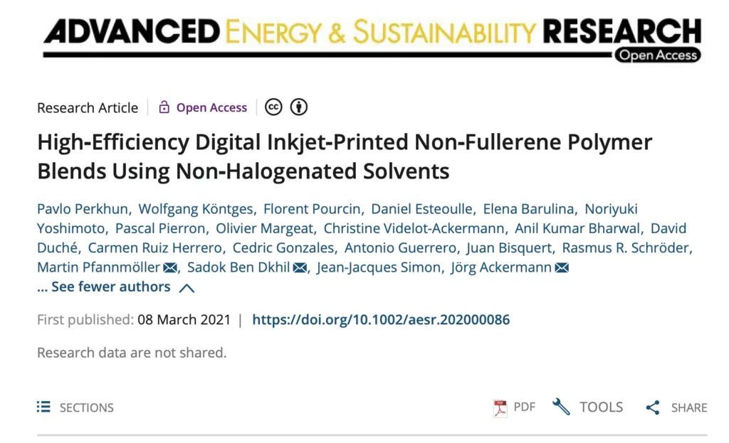 Afin d'obtenir des performances plus élevées pour les modules OPV de petite taille, nous avons développé une nouvelle couche basée sur de nouveaux matériaux appelés NFA (non fullerene acceptor). Avec ces nouveaux dérivés, notre équipe et nos collaborateurs universitaires ont obtenu une mention spéciale dans Advance Energy & Sustainability Research. Nous sommes d'ores et déjà en plein intégration de cette application dans notre process d'industrialisation.